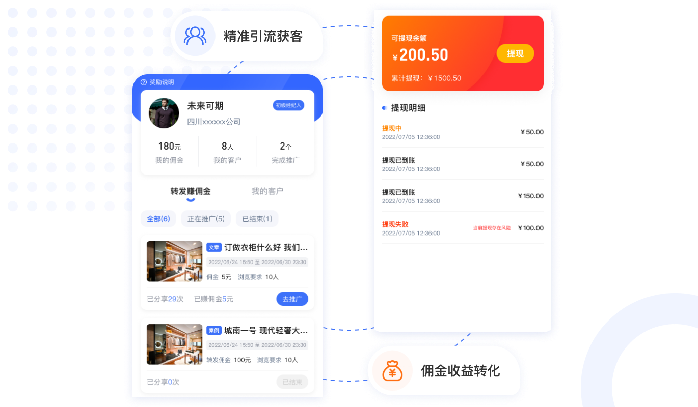精準(zhǔn)引流,客戶軌跡追蹤推送、深度洞察客戶需求。 快速鎖客,直接對(duì)話消息及時(shí)提醒,增加量房量為銷售賦能。